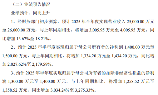 事件:公司预计2025年半年度实现营业收入2.5-2.6亿元,同比增加13.67%至18.21%;实现净利润1400-1500万元,同比增2027.62%至2179.59%;实现扣非净利润1300-1400万元,同比增加3034.24%-3275.33%。