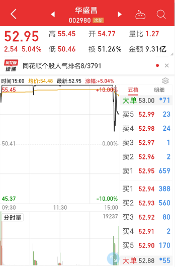 早盘一度连续6涨停的次新股华盛昌,尾盘突现炸板,收盘涨5.04%。公司今年一季度实现营业收入2.1亿元,同比增长90.05%;实现净利润8959万元,同比增长322.89%。次新龙头被砸,但依然有通达电气、泉峰汽车、景津环保、天迈科技等多只已开板次新股涨停。