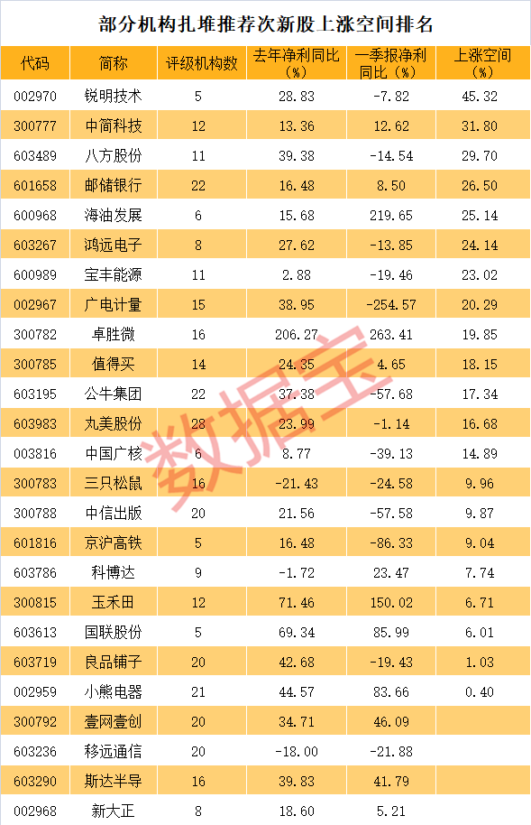 榜单中上涨空间最大的是通信行业的锐明技术。5家机构评级,一致目标价超过161元,上涨空间超过45%。公司去年分配方案为每10股税前派8元转增10股(预案)。另外,中简科技、八方股份、海油发展等个股上涨空间均超过20%。