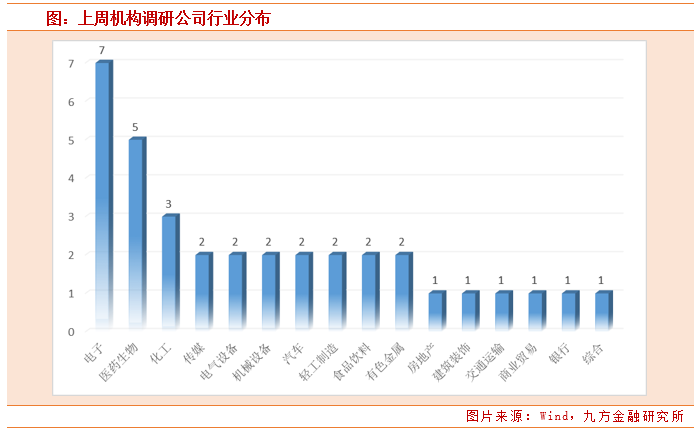 从行业分布来看,上周机构重点调研了电子行业,有7家公司获得机构关注,其次是医药生物、化工行业,分别吸引了5家、3家机构进行调研。