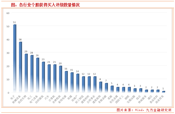 行业分布方面,电子行业获得了51份的买入评级研报,居首;其次为机械设备、医药生物、化工行业。