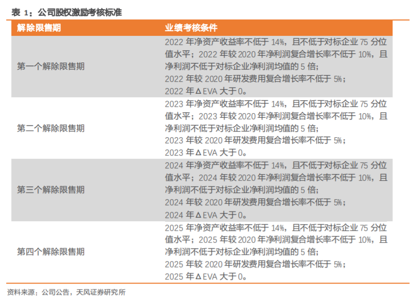 激励计划的业绩考核目标:公司2021年推出股权激励计划,面向公司董事、公司及下属单位高级管理人员,研发、工程、营销等不同层级核心骨干,以达到业绩考核目标作为激励对象的主要解除限售条件,在ROE、净利润增长、研发费用增长与ΔEVA均有考核标准,四个解除限售期分别要求2022-2025年各年的净资产收益率均不低于14%;较2020年净利润的复合增长率不低于10%。经我们测算即公司净利润需要在2022—2025年分别达到63.07/69.36/76.30/83.93亿元,公司22-23年净利润分别达到69.05/76.5亿元,20-23年净利润复合增长率实际完成13.65%;较2020年研发费用复合增长率不低于5%,经我们测算即公司研发费用在2022—2025年分别达到20.47/21.49/22.57/23.70亿元。