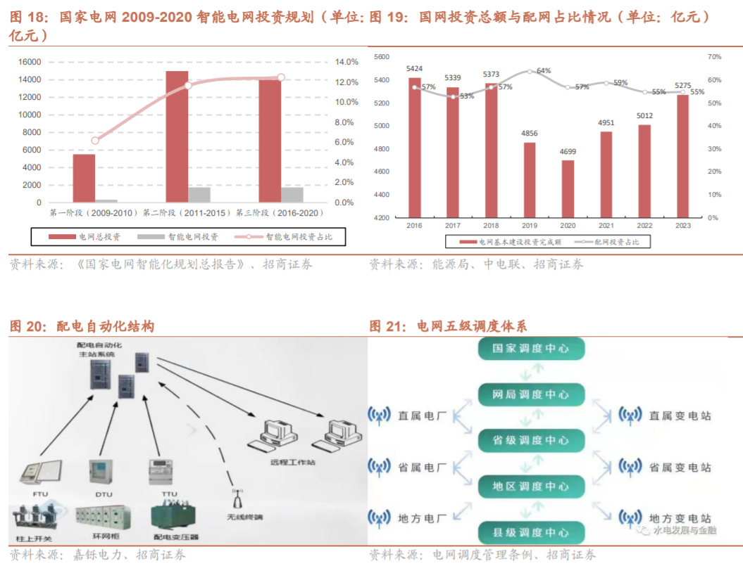 配电网投资占比可能有所提升,智能化、自动化是发展方向:2023年电网工程建设完成投资同比增长5.4%。电网企业进一步加强农网巩固提升及配网投资建设,110千伏及以下等级电网投资占电网工程完成投资总额的比重达到55.0%。2024年国家发改委、能源局印发《关于新形势下配电网高质量发展的指导意见》、《加快构建新型电力系统行动方案(2024—2027年)》,强调有序扩大配电网投资,开展配电网升级改造,强调配电网高质量发展、智慧化调度体系建设,同时提出了建设一批虚拟电厂。