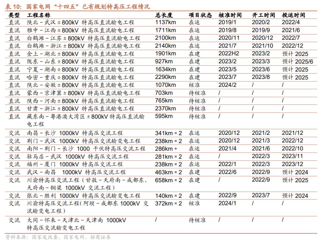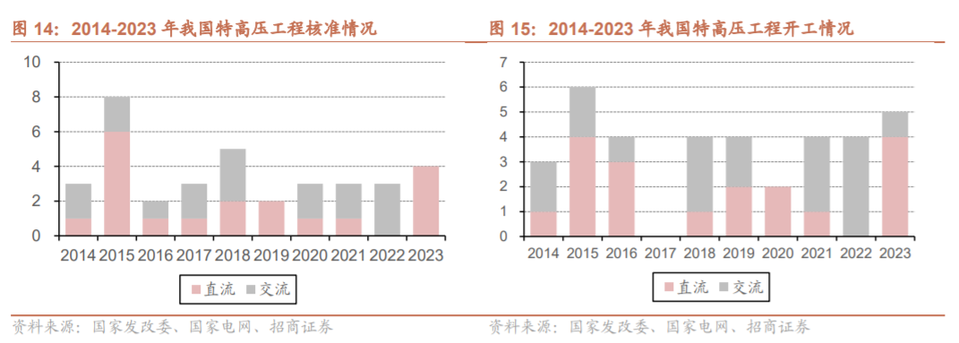 特高压或迎来加速建设。为应对大规模能源外送问题,国家电网规划“十四五”期间建设“24交14直”共计38条/段(单条交流项目可能包括多段)特高压输电工程,总投资3800亿元。截至2023年底,直流已投运4条并有4条在建,交流已投运5条并有3条在建。2024年以来,新核准的阿坝-成都东1000kV交流与陕北-安徽±800kV直流分别已于1月11日、3月15日开工,核准后开工进度显著加速。据目前统计,至少还有4条直流和1条交流待开工。考虑“十四五”规划完成情况与特高压建设周期,预计2024-2025年将在“4+4”(年均在建4个特高压项目、核准4个新项目)的基础上迎来密集建设期。