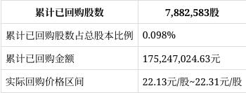 国电南瑞:回购5-10亿,已经回购1.75亿。回购期限自2025年4月14日起不超过12个月,至2026年4月13日止,2025年回购价格上限,由34.13元/股降至33.70元/股。截至2025年6月30日,公司以集中竞价交易方式累计回购股份7,882,583股,占总股本8,032,088,259股的比例为0.098%。实际回购价格区间在22.13元/股至22.31元/股,支付资金总金额为175,247,024.63元(不含交易费用)。