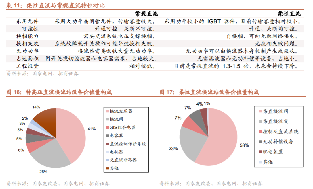 柔性直流开始商业化规模应用。与常规特高压直流相比,柔性直流器件有过0关断等能力,可控性更好。在海上风电、孤岛供电、背靠背联网,以及多端直流系统方面,都有突出的优势。过去受限于造价高、输送容量有限等,柔直技术商业化应用仍不广泛。随着可关断器件、直流电缆制造水平的不断提高,经过十多年的发展,主要技术与工程、供应链问题得以解决,目前已经开始商业化规模应用。