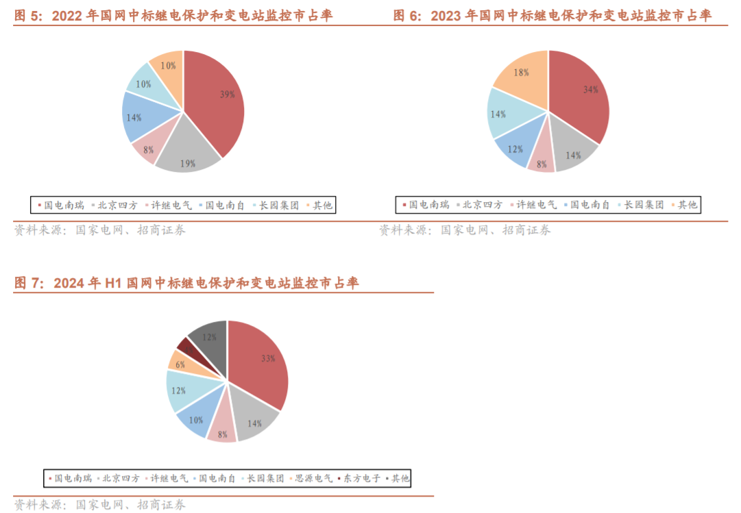 公司在继电保护和监控自动化领域市占率大幅领先。公司通过前期注入南瑞继保电气公司,实现了在继电保护、监控自动化两个领域的领先优势。公司2022/2023/2024H1在国家电网输变电设备集中招标中,继电保护和变电站监控市占率为39%/34%/33%,市占率居第一。
