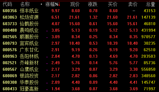 造纸板块今日盘中大幅走高,截至发稿,恒丰纸业涨停,松炀资源涨逾6%,仙鹤股份、晨鸣纸业、顺灏股份等涨幅超3%。