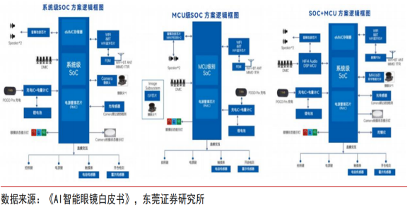 芯片是AI眼镜核心部件,目前AI眼镜SoC主要有3种方案。一是系统级SoC方案,该方案集成了CPU、GPU、DSP、ISP等模块,集成度较高,具备强大的计算能力,可以支持AI、音频、视频、拍摄、无线通讯等多个任务处理,整体性能较强,但功耗、价格相对较高,对续航要求比较高,比如Ray-BanMeta采用了高通AR1芯片。二是MCU级SoC+ISP方案,集成度较低、可提供功能较少,功耗及成本较低。三是SoC+MCU方案,兼顾低功耗和高性能,能够在保证续航的同时支持多个应用,但方案整体成本比较高,且对芯片设计能力、系统开发能力要求比较高。目前系统级SoC方案中,主要采用高通和紫光展锐方案.