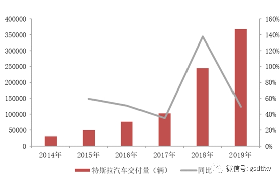数据显示,特斯拉2019年产销量分别为36.52、36.75万辆,其中销量同比增长50%,达到此前全年交付36万至40万辆的目标。产量低于销量验证了年末公司库存脱销的官方说法,部分原因在于2020年美国税收抵扣额度将取消导致消费者年底抢购。2014年至2019年,特斯拉交付量从3.2万辆增长到36.75万辆,年均增速达到63%。单季度销量情况来看,2019年四季度,特斯拉交付汽车11.2万辆,同比增长23%,单季度交付量达到历史新高。