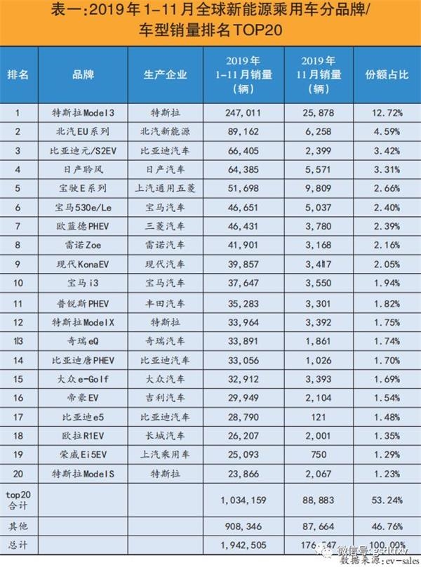 图二:2019年1-11月全球新能源乘用车市场份额情况