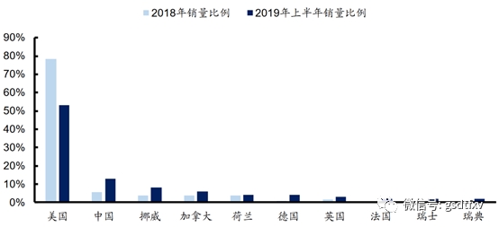 然而,在中国这样全球规模第一的市场中,特斯拉多年的市场占有率并不高。美国仍然是特斯拉最大的销售市场,2018年来看,美国市场占据特斯拉销量的79%,中国市场仅占特斯拉销量的6%,而2018年中国市场占据全球新能源汽车销量的53%,美国仅占13%。不过,2019年特斯拉在中国市场也的确呈现良好的增长态势,根据2019年上半年数据,美国市场占据特斯拉过半销量(53%),中国市场屈居第二(13%),但相比2018年6%的数据已经翻倍。考虑到中国作为全球新能源车主力销售国家,特斯拉作为智能新能源汽车的标杆所具备的强大市场号召力,叠加上海超级工厂产能的持续提升和国产主力车型所具备的可观的降价空间等诸多因素,未来特斯拉在中国市场份额具备极高的提升空间。
