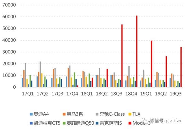 当前特斯拉的Model3所处的阶段与曾经的iPhone4颇为相似。Model3在美国已成爆款明星车型,起售价3.5万美元的特斯拉Model3一经推出就成为电动车市场的强劲竞争者。随着产能瓶颈问题的解决,交付量季季攀升,Model3已经统治了美国电动车市场。根据Marklines数据,19年1-10月美国整体电动车销量25.4万辆(不含普混),渗透率为1.78%。而特斯拉仅Model3的销量就占到美国新能源汽车销量的45%,占纯电动车市场份额达到61%。2018Q1开始,Model3基本追平同级别豪车市场销量,2018Q3开始遥遥领先。2019年Model3实现了对美国中小型豪车市场(含燃油车)的完美称霸,19年销量超过宝马2/3/4/5系总销量,超过奔驰C级/E级的总销量。