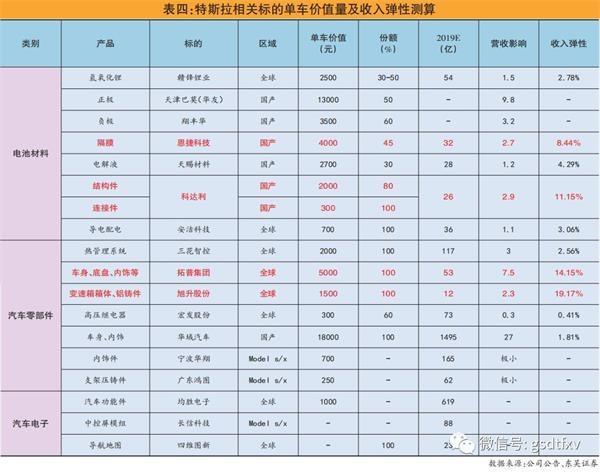 国内产业链受益主要集中在零部件领域。根据东吴证券测算数据,国产Model3单车价值量较高的汽车零部件标的为:华域汽车、拓普集团、旭升股仹、三花智控,材料供应商为:科达利、恩捷股仹、赣锋锂业、天赐材料。此外,以2020年15万辆Model3产量计算,收入弹性较高的依次为:旭升股份、拓普集团、科达利和恩捷股仹。