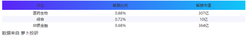 从行业角度来看, 医药生物、综合、非银金融行业下周解禁比例最大, 银行、非银金融、医药生物行业下周解禁市值最大。