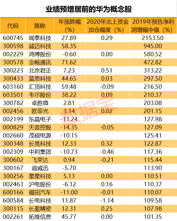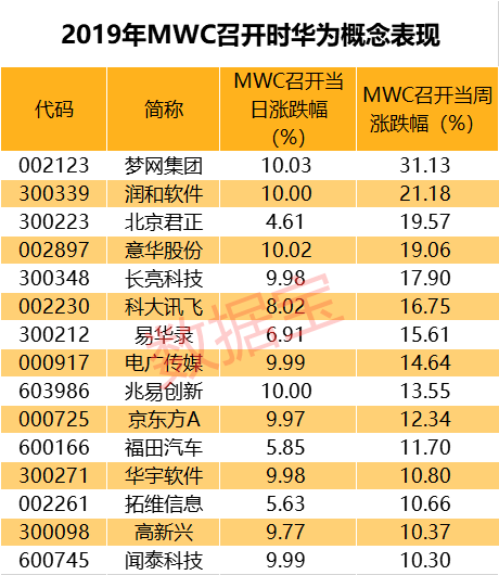2019年,借助MWC上华为的亮眼表现,华为概念股在大会召开当日和当周都有着很好的表现,梦网集团、润和软件、北京君正、兆易创新、京东方A等个股都涨幅惊人,赚钱效应高涨。