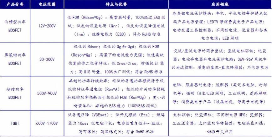 公司的主要产品种类丰富,拥有覆盖了12V~1700V电压范围、0.1A~450A电流范围的多系列细分型号产品,是国内领先的半导体功率器件行业中MOSFET产品系列最齐全且技术先进的设计企业。