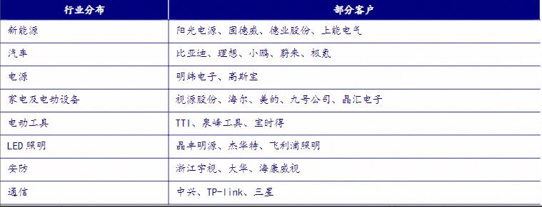 随着新能源等下游应用领域的兴起,公司重点发展了新能源车、光伏、储能等中高端行业,已经实现对比亚迪、阳光电源等行业头部企业的大批量出货。