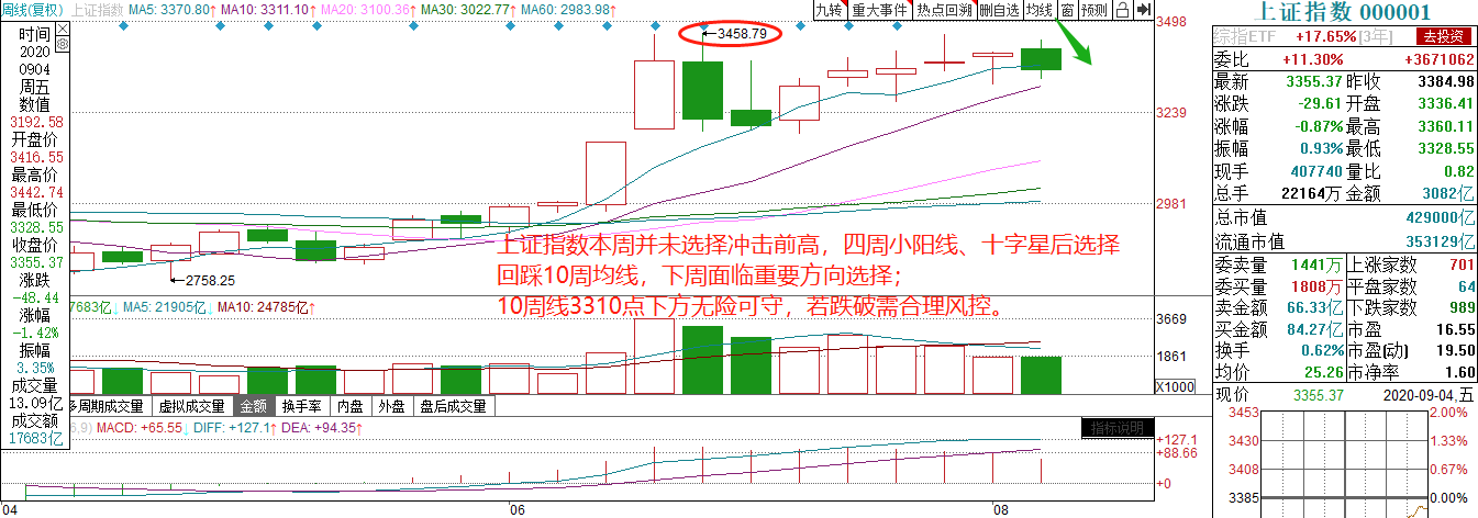 本周一,我们分析过上证指数的周K线,彼时上证指数周线5连阳接近前期高点面临选择,当时不确定会突破还是回踩确认,周五收盘给出了答案。今日上证指数的低开高走保证了10周线的支撑尚在,而非跌破,下周核心的关注点是上证指数能否依托10周均线展开反弹。若跌破,下方短期暂时无险可守,调整幅度将会加深。