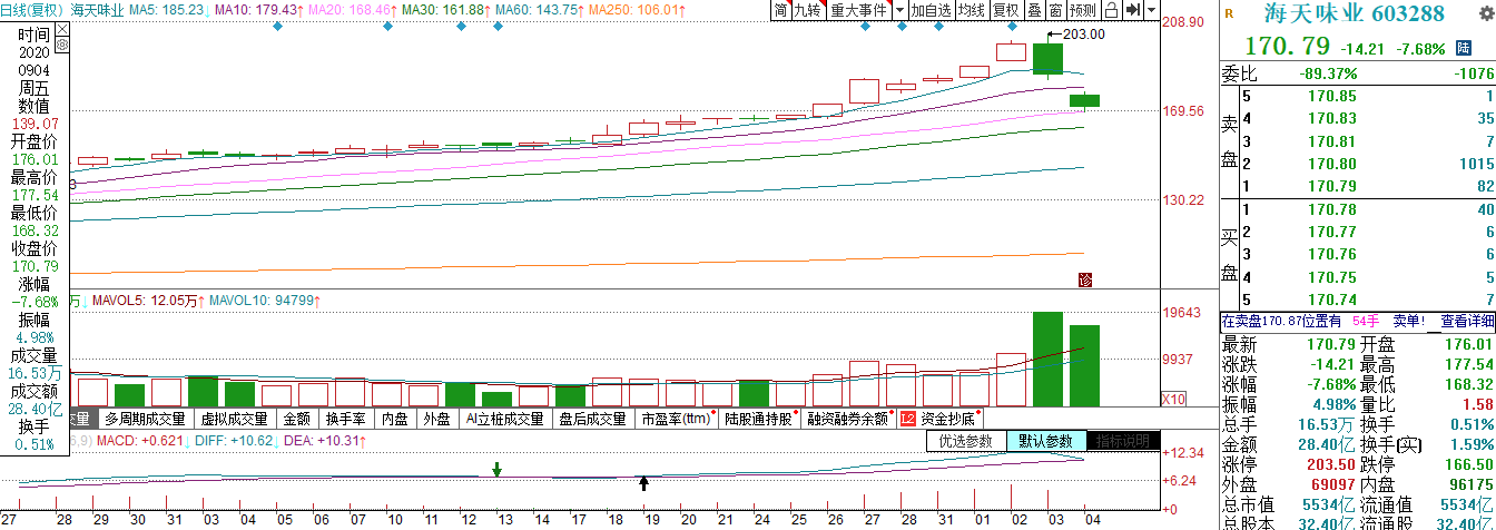 而当先觉资金嗅到危险气息的时候,海天味业已遭遇近期最大的两天连续调整,跌幅达15%。