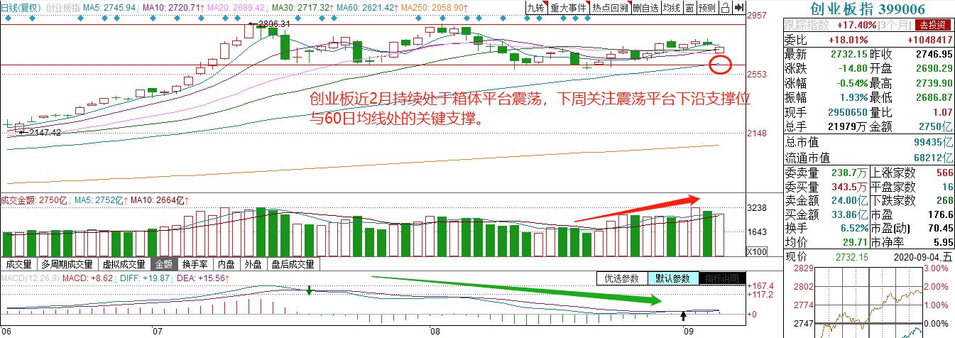 创业板目前较为关键的支撑位在箱体震荡下沿与60日均线处的2600点上方。
