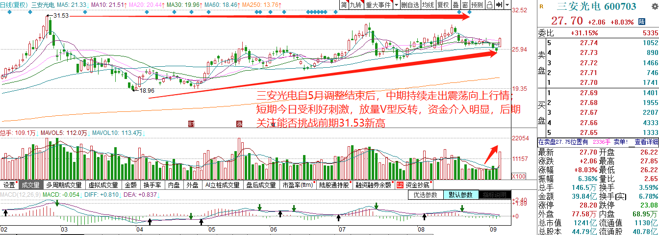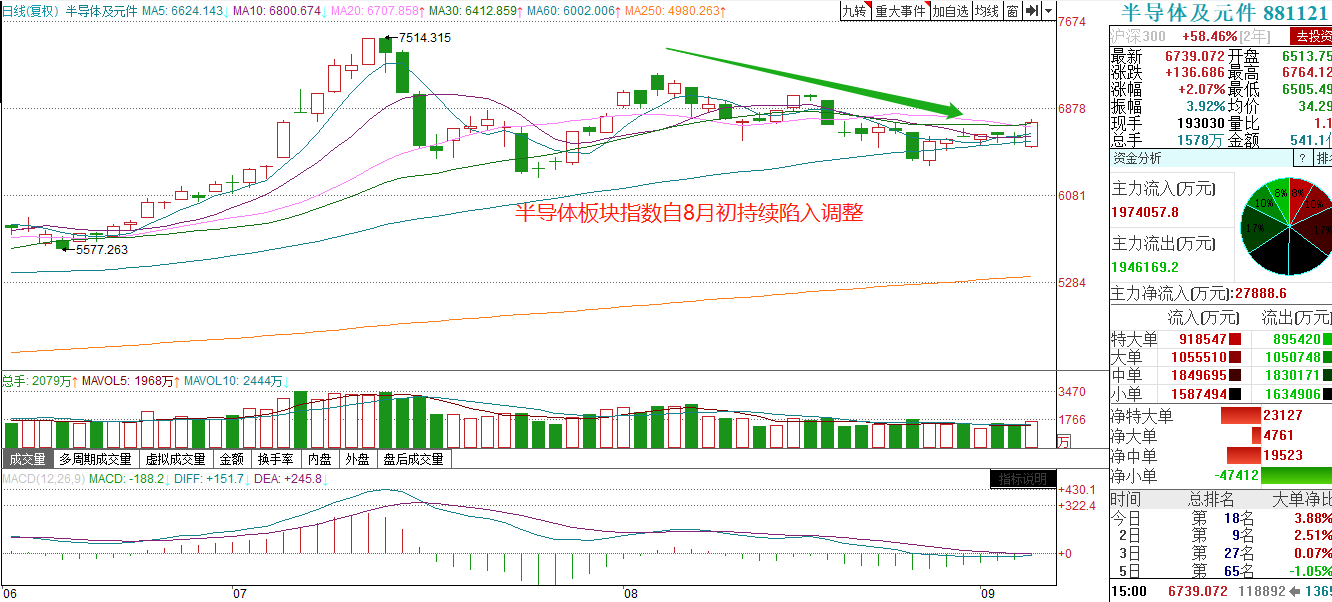 所以自8月起半导体板块持续处于杀估值的调整走势,而从短期看,板块内有一定的超跌反弹,今日加之半导体板块的重磅利好,板块迎来大涨。