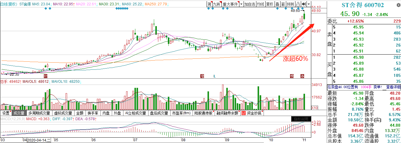 ST舍得2015年~2019年由700万得净利润增长至5.08亿,翻了72倍,是毫无疑问的优质成长股。2020年受疫情影响,中报扣非利润增速-18.66%,三季报已收窄至-5%,年报表现值得期待。
