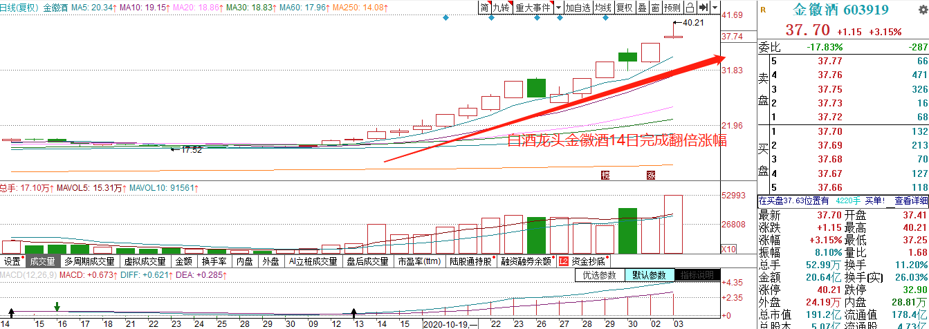 白酒股近期绝对是市场上表现最亮眼的明星,板块指数自底部突破上涨涨超23%,龙头金徽酒更是14天翻倍。今日白酒板块再次走强,迎驾贡酒、金徽酒双双涨停、伊力特大涨9.5%。