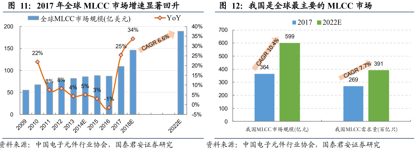 受益于行业供需格局优化,全球MLCC市场增速显著回升。根据中国电子元件行业协会信息中心预计,2018年全球MLCC市场规模达146.4亿美元,到2022年将达189.4亿美元,2018-2022年复合增速为6.6%。2017年我国MLCC市场规模364亿元,占全球MLCC市场比例约50%,是全球最主要的MLCC市场;预计到2022年,我国MLCC市场规模将达到599亿元,行业复合增速为10.4%。