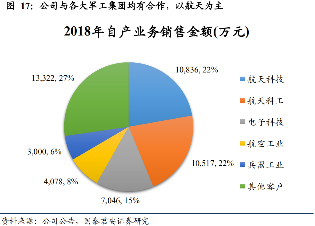 公司与多家军工集团建立了良好稳定的合作关系,是航天科技集团、航天科工集团等客户的核心或优秀供应商。2018年,公司自产业务中,对航天科技和航天科工销售额均上亿,合计占自产业务销售总额的44%。