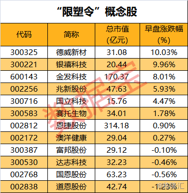 证券时报·数据宝梳理发现,A股涉及改性塑料、生物降解塑料等相关产业的公司中,今日开盘均有不俗表现,其中德威新材、银禧科技均涨停,亚太最大的改性塑料生产企业金发科技上涨8%,兆新股份、国立科技涨幅均超过4%。