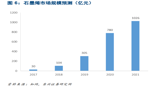 在国内政府推出了众多利好政策推进石墨烯产业化进程的大背景下,全国各地建立了多个石墨烯产业园和石墨烯联盟,随着研究技术的进步,现在很多石墨烯相关产品已经开始商业化进程,东兴证券预计2020年我国石墨烯市场规模较2019年将翻一番,达到780亿元,2021年达到1026亿元。