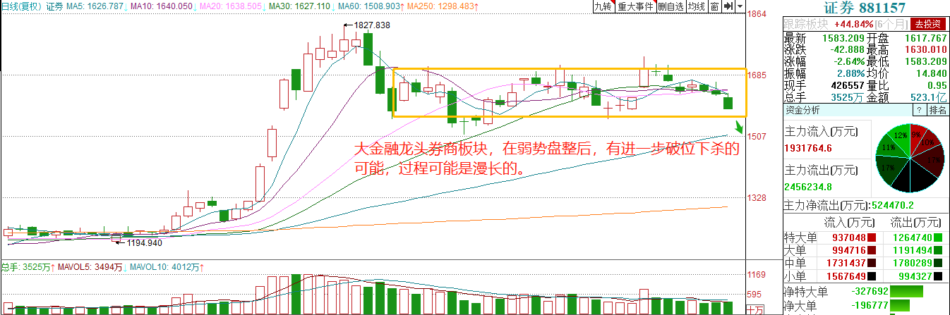 1、步入进一步调整周期,反弹需看大金融脸色。上证指数近几日的弱势走势,大金融无疑是罪魁祸首了。大金融之首券商板块,在注册制等利好刺激下持续弱势盘整,似乎这些利好早已反映在第一波上涨之中了,当前证券板块指数有进一步破位下跌的风险,而上证指数能否止跌反弹,恐怕也需要看大金融的脸色了。