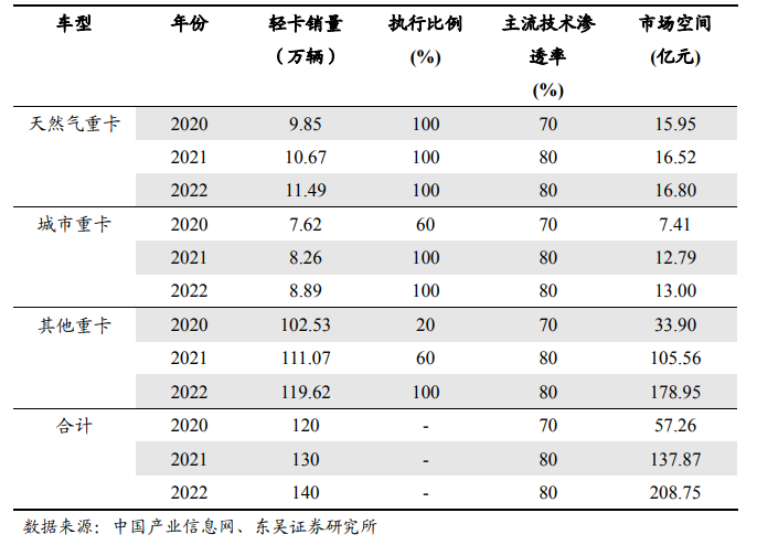 假设 2020 年至 2022 年国内乘 用车销量分别为 2100、2200、2300 万辆,预计国六尾气后处理市场乘用车空间将分别达到 267.54 亿元、549.12 亿元和 562.12 亿元。