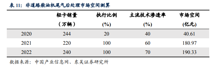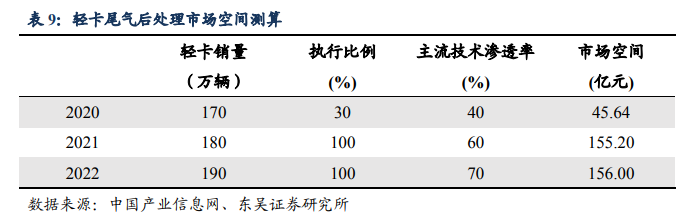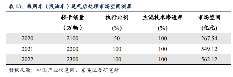 根据东吴证券对乘用车(汽油车)尾气后处理市场空间进行测算: