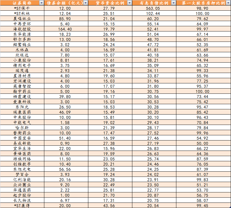选取有息负债比率高于20%,货币资金比率高于15%,且大股东累计质押股份比例超过50%的公司,共有39家公司符合标准。当然,财务指标只是一个角度,这样筛选出来的企业只是符合存贷双高的情形,并不意味着财务信息质量一定较低,也不意味着债券风险必然较高,仍需仔细甄别。