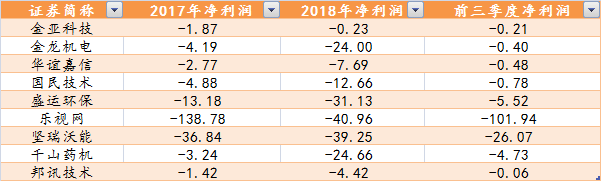 创业板公司中,16只个股连续2年亏损,且金亚科技、金龙机电、华谊嘉信、国民技术、盛运环保、乐视网、坚瑞沃能、千 山药机、邦讯技术今年前3季度继续亏损。
