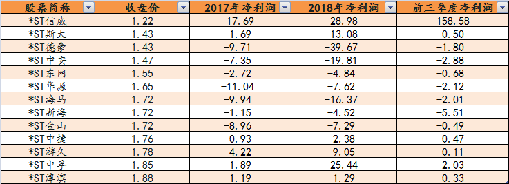 *ST信威、*ST斯太、*ST德豪、*ST中安、*ST东网、*ST华源、*ST海马、*ST新海、*ST金山、*ST中捷、*ST游久、*ST中孚*ST津滨此前连续两年亏损,且今年前三季度继续亏损。