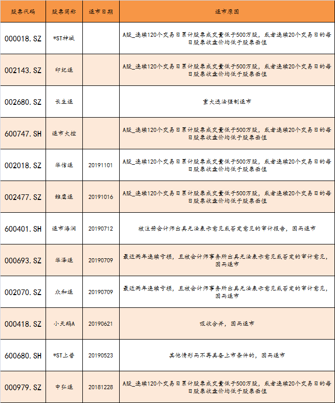 2018年年底以来,先后有中弘股份、*ST雏鹰、*ST华信、印纪传媒、*ST大控、*ST神城等6只触发面值退市。