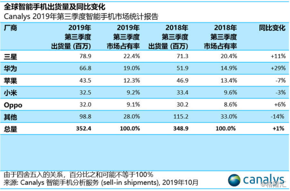 从市场行情来看,2019年第三季度全球智能手机出货量3.52亿部,同比(较上年同期)增长1%,出现回暖之象。具体而言,三星的出货量排名第一,达到7890万部,同比增长11%;华为以6680万部占据第二,同比增长29%;苹果紧随其后,出货量为4350万部,同比下降7%;小米和OPPO排名全球前四和前五位,分别出货了3250万部和3200万部。
