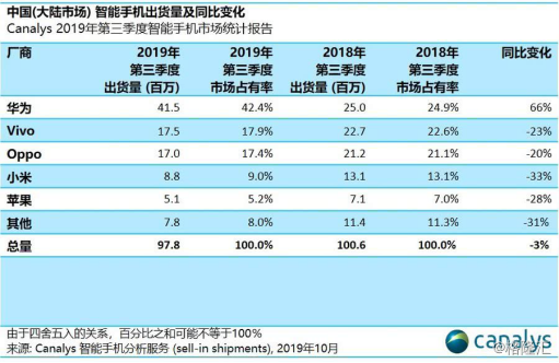 在其中,就我国市场来看,2019年前三季度国内手机市场总体出货量2.87亿部,同比下降5.7%;且2019年前三季度我国手机产量为125828.6万台,同比下降6.4%;此外,华为以出货量4150万占据42%的市场份额,坐稳第一,vivo和OPPO紧随其后,小米则排在第四。