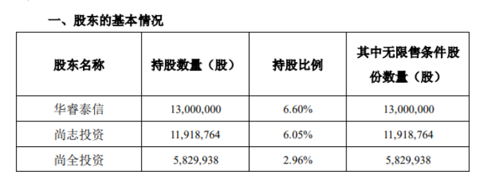 资料显示,华睿泰信持公司股份13,000,000股,占公司总股本的6.60%;尚志投资持公司股份11,918,764股,占公司总股本的6.05%;尚全投资持公司股份5,829,938股,占公司总股本的2.96%。
