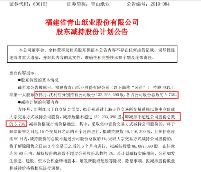 与上述两家公司相比,青山纸业(600103.SH)股东的减持计划计划更为庞大。