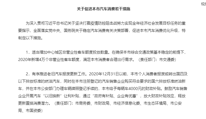5月20日,上海市政府披露了汽车消费的促进政策。