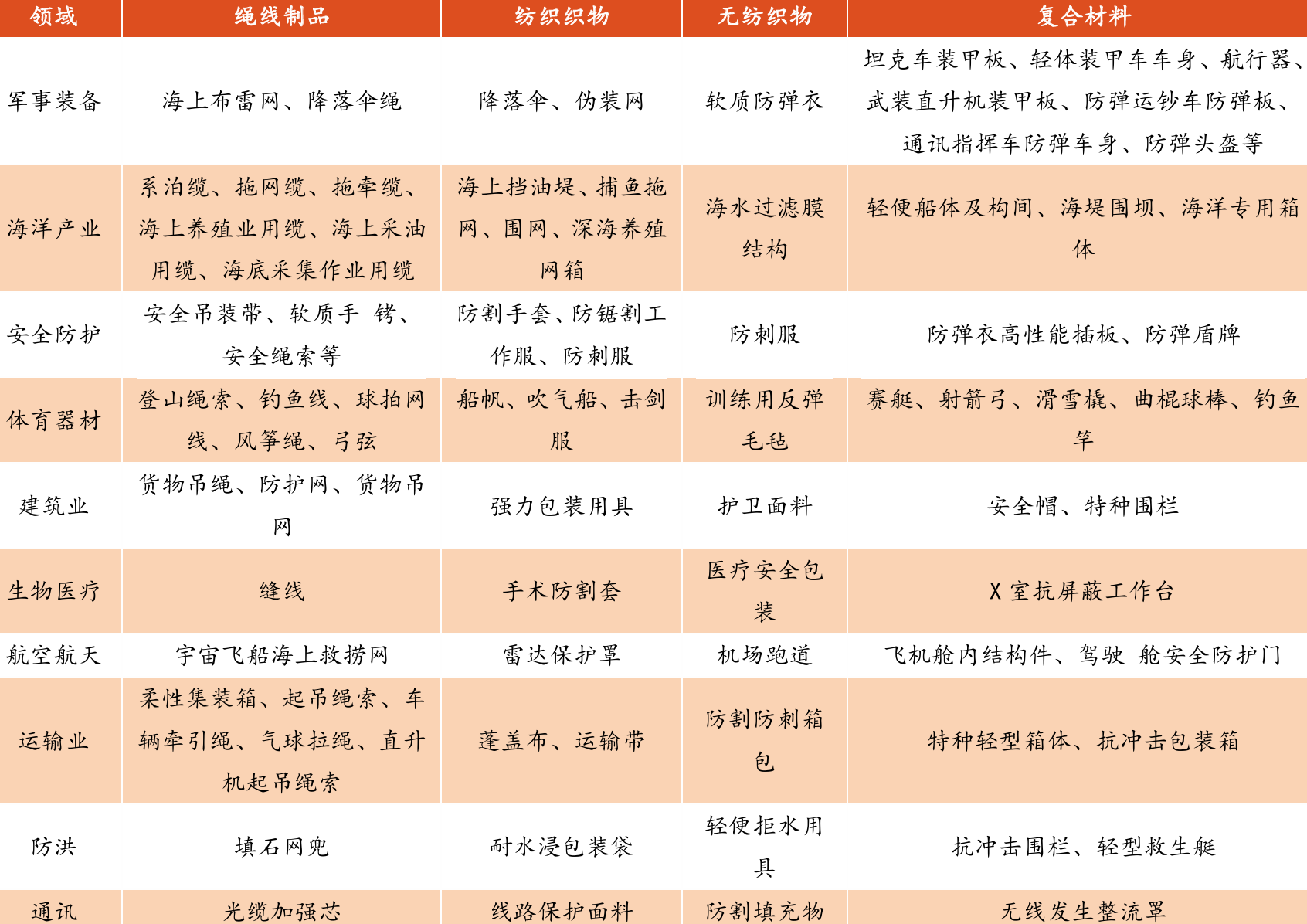 图:超高分子量聚乙烯纤维主要应用场景 |
