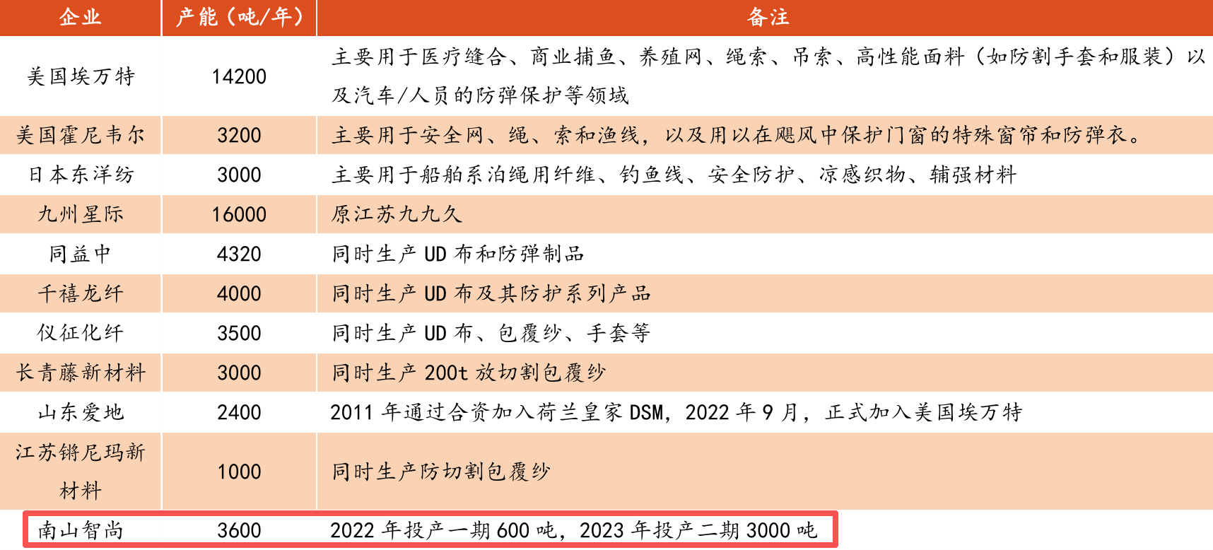 国内以同益中、南山智尚为代表的企业突破40cN/dtex强度产品,在军用 领域突破海外技术垄断实现国产替代,未来国内厂商将进一步追求极致性能, 并逐步突破航空航天、医疗手术缝合线等超高端产品。