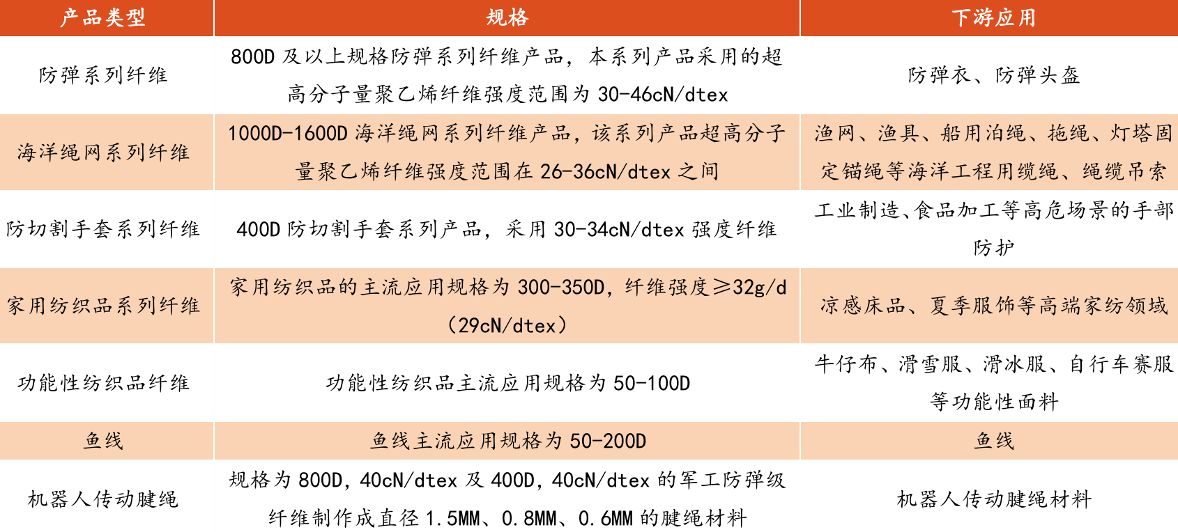 纤维品质及强度处于国内第一梯队,产品系列丰富覆盖军民两用领域。公司超高分子量聚乙烯纤维可生产100D-2400D、26cN/dtex-42cN/dtex等不同规格的产品,纤维品质及强度处于国内第一梯队,接近国际龙头水平。产品系列覆盖防弹、海洋绳网、防护用品、家用纺织品、功能性纺织品、鱼线、机器人灵巧手传动腱绳等领域。