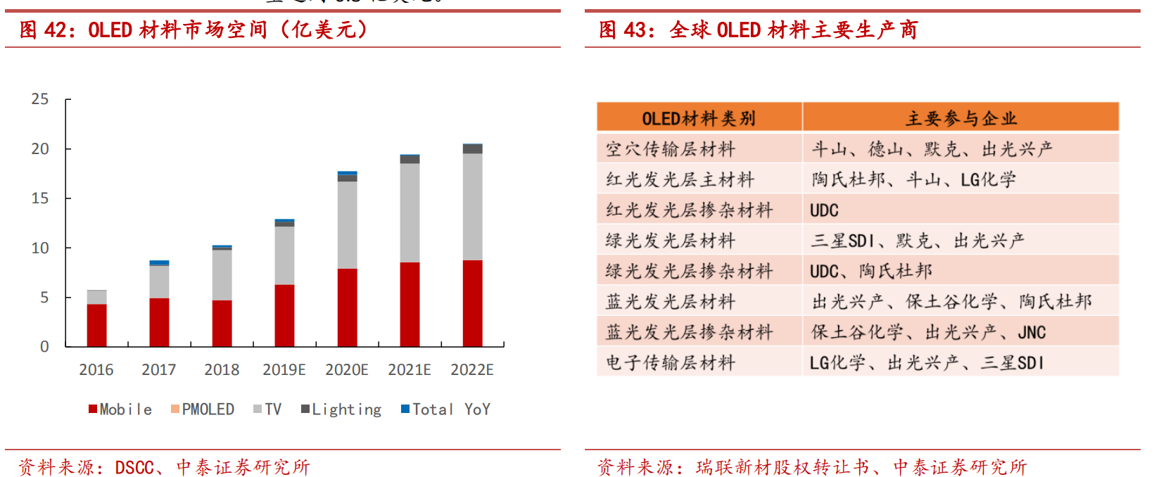 据DSCC,全球OLED终端材料市场规模有望从2017年的8.29亿美元增长至2022年的20.4亿美元(复合年增长率为20%),其中电视用OLED材料将成为重要的增量。OLED中间体和升华前材料市场空间在2022年有望达到6.8亿美元。