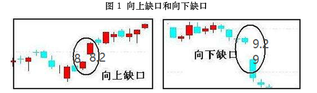 缺口是K线图中的一种特殊形态,缺口的出现打破了K线的连续性,如下图所示,分别是向上缺口和向下缺口。