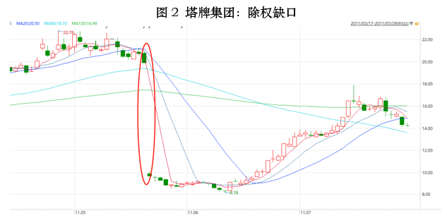 上图塔牌集团在实行10转10派0.8后出现了一个巨大的除权缺口,股价从前一交易日的19.88元降至次日9.89元,其实不是股价一夜间蒸发了一半,只是除权除息后形成的,只要我们点击前复权,K线图就会自动修复为正常形态。因此,除权缺口不算真正的缺口。